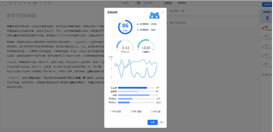 工具带有一个文档分析功能,阅读时间、朗读时间、正负情感、情绪强度、成语数量等等