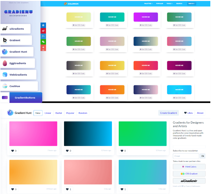 作为网上最佳渐变网站的精选列表,Gradient Backgrounds可以尝试和选择数百种漂亮的混合调色板。该项目融合了在构建渐变颜色选择器CSS Gradient和背景图像工具Cool Backgrounds时开发的两个想法。