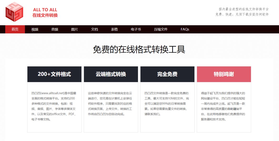 「凹凸凹」(All To ALL)是国内一家最全类型的在线文件转换平台,免费、快速,无须下载安装任何软件,致力于提供免费并且好用的在线转换服务,一站在手,转换无忧。
